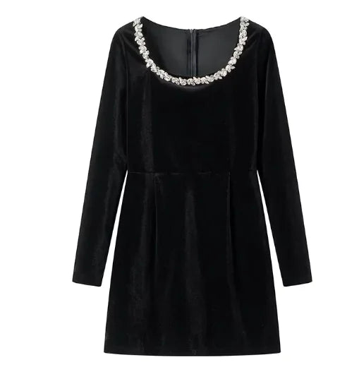 This elegant and feminine dress features a timeless square neckline and a graceful A-line silhouette. The dress is adorned with delicate floral patterns and sparkling rhinestones, adding a touch of luxury and sophistication. The long sleeves provide warmth and coverage, making it perfect for spring evenings or cooler summer days. This dress is a versatile piece that can be dressed up for special occasions or down for a casual outing.